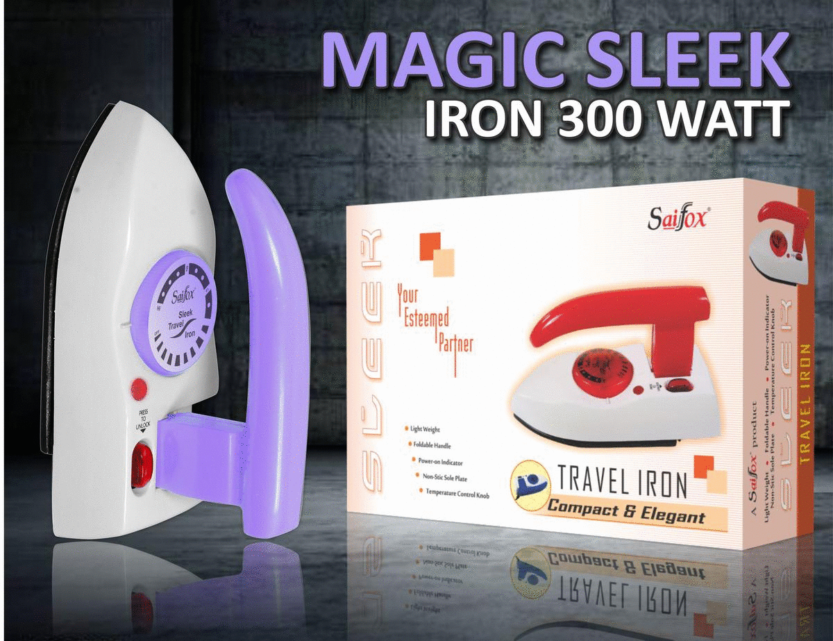 MAGIC IRON-900 COMPACT & ELEGANT 700 W * Foldable Handle & Easy Grip * Compact design * Power on Indicator =_~ * Non-Stick Sole Plate ew * Temperature Control Knob Weight : 380 gms Approx (when packed) Sie > 18x12x8cm Operateson : AC-230v/50-60 Hz C